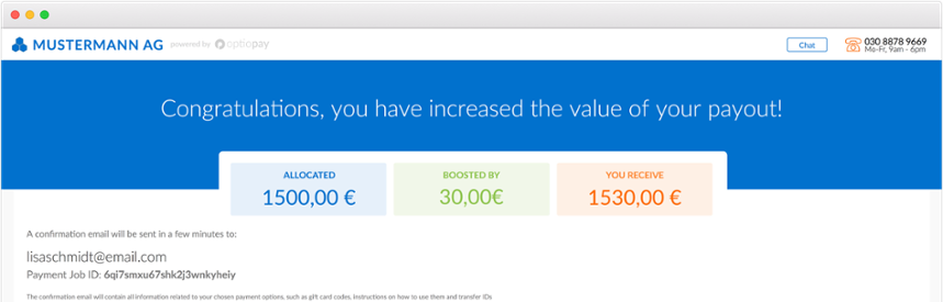Excite your customers by letting them decide how to receive their money. This way, your recipient could convert your 100 € payment into a gift card worth 120 €, at no extra cost to you!